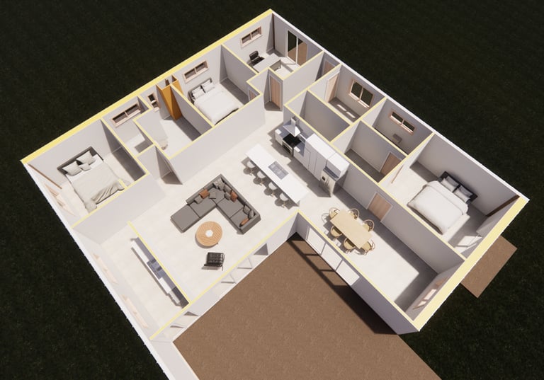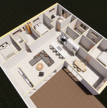 This residential project was designed in a square and Health shape to house a family of four, with a primary focus on a metal structural system. This structural choice served as a basis for organizing the living spaces efficiently, emphasizing both the functionality of the space within. In addition, natural light and ventilation were maximized by increasing the number and size of windows throughout the house, which created a brighter and more open atmosphere that enhances the living experience.